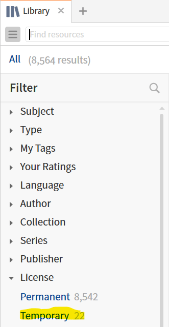 To identify resources like this already in your Logos library, open a new Library tab. Then, find “License” under the filter options, and choose “Temporary.”