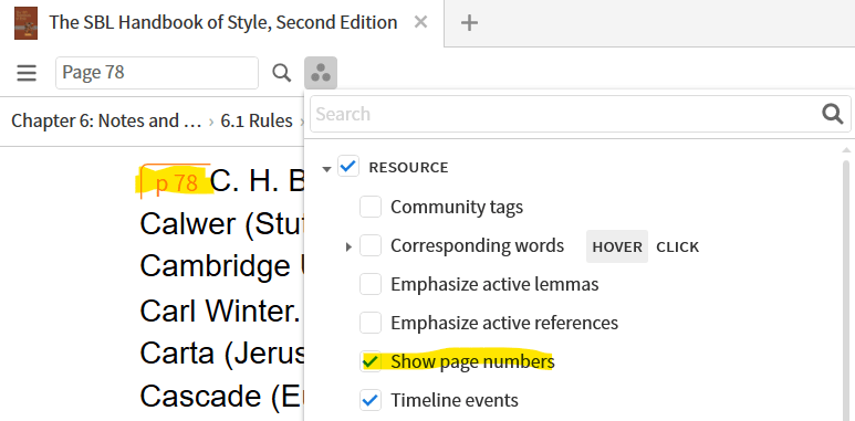 Turning on page numbers makes it very simple to cross-compare with print texts or to cite directly from Logos resources.