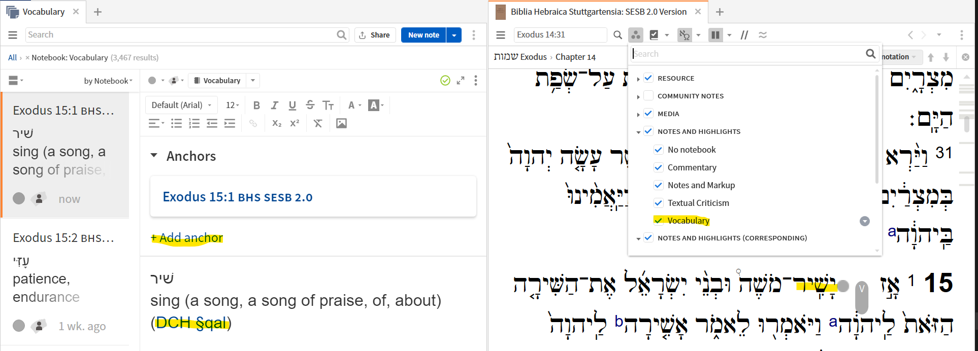For instance, I have a notebook for Vocabulary. When I come across a word I don’t recognize, I’ll look it up—typically in either the Dictionary of Classical Hebrew or BDAG.