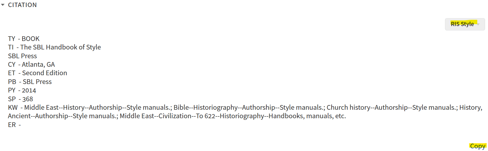 With the Information panel open, find the Citation section. Then, choose an export format that your bibliography manager can accept (e.g., RIS), and click Copy.