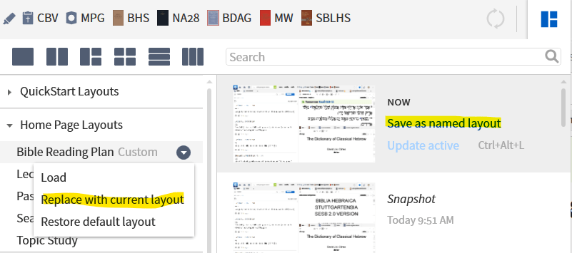 If you do something similar, you likely have a preferred set of resources to work with and a preferred way of arranging them on the screen. Once you’ve got everything opened and arranged as you want it, take a second to update the Bible reading plan layout to reflect the current layout from the Layouts menu.