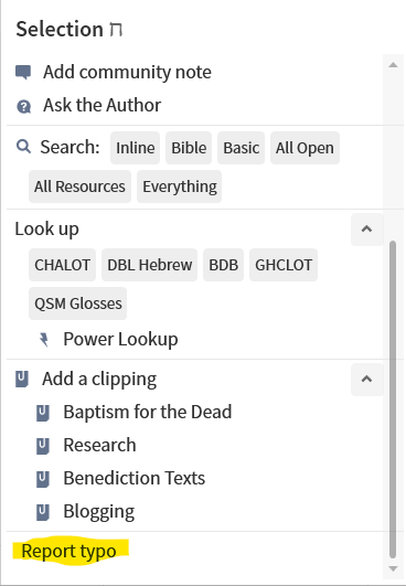 You can let Logos know what you’ve found easily on the spot. Just highlight the error in the text with your mouse, open the fly-out menu, and choose Selection. You’ll find the Report typo tool at the bottom of that menu.
