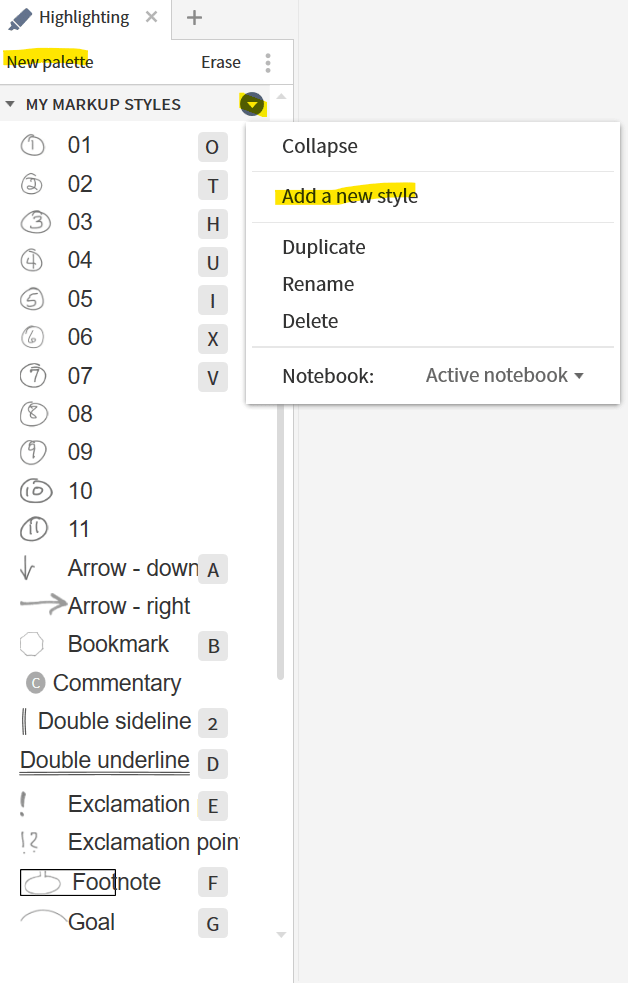 You can create a new markup palette from the Highlighting panel. Then, you can add as many markup styles as you want underneath that palette to use in any Logos resource.