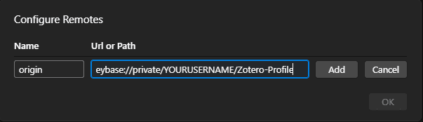 keybase://private/YOURUSERNAME/Zotero,https://gitlab.com/YOURUSERNAME/Zotero.git, orhttps://github.com/YOURUSERNAME/Zotero.git.7