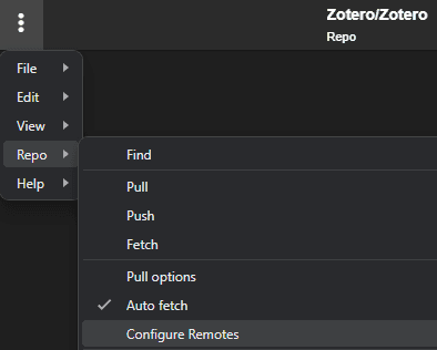 With GitFiend open, go to the three dots menu, and choose File > Clone Repo…. In the URL or path box, add your Git host’s repository URL (e.g., keybase://private/YOURUSERNAME/Zotero). In the Where to clone to box, add the path where you just deleted the contents (e.g., C:\Users\[your username]\AppData\Roaming\Zotero).