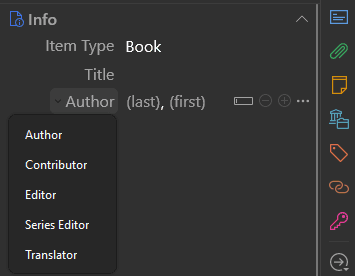 To modify a creator type, click the creator type that you see displayed (e.g., Author). Then, choose the appropriate alternative type.
