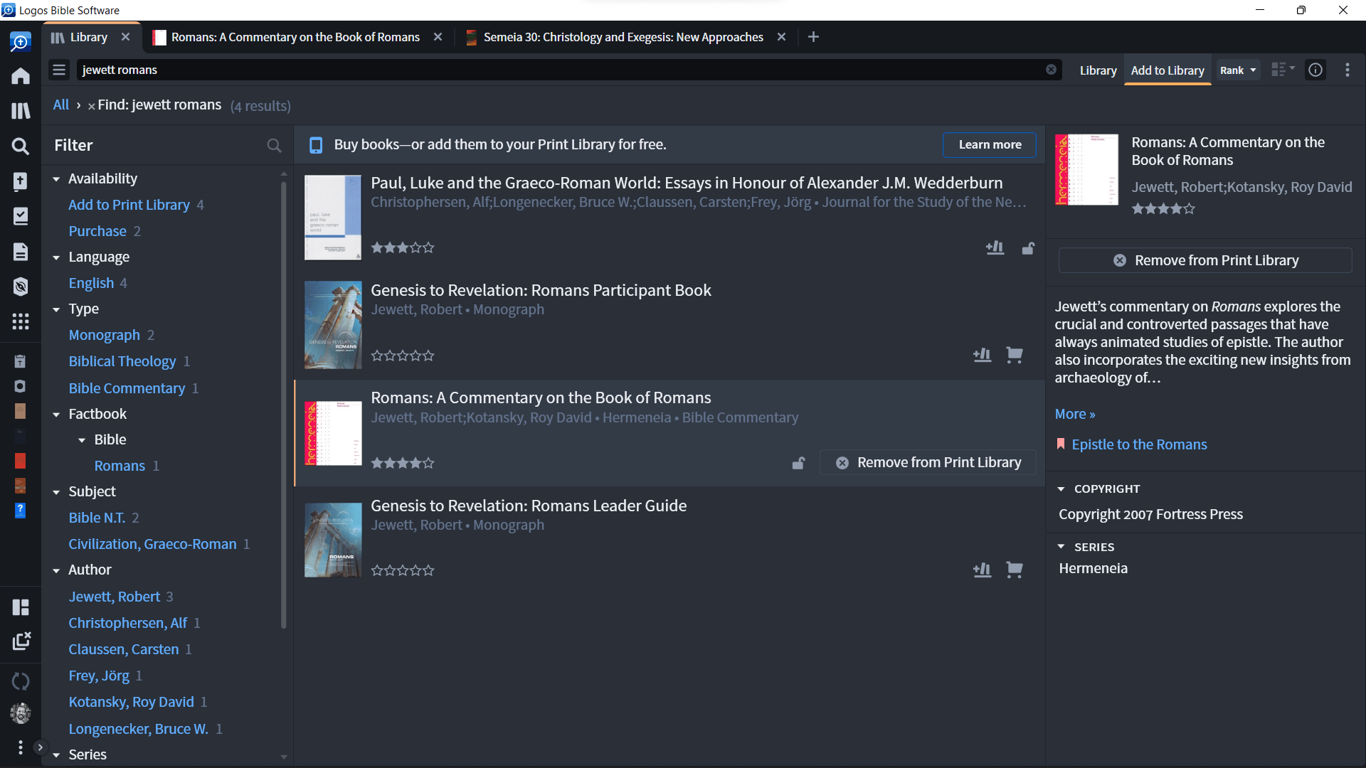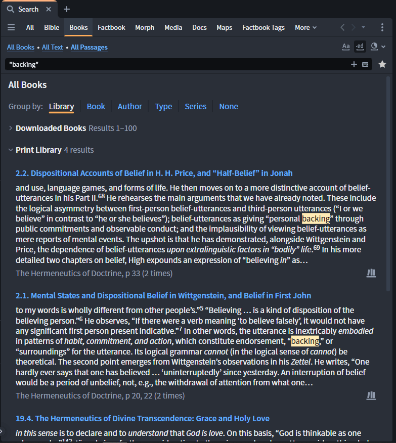 The search pane now includes a section for results from your “Print Library.” This section will populate with search results from any text that you’ve added in Logos as part of your print library. The search results will also tell you the exact page(s) on which those each result occurs.