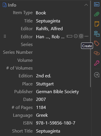 Within Zotero, you almost never see a Creator field as such. Instead, for different types of resources, have different types of creators available in the interface. For resources related to biblical studies, the most common creator types, include