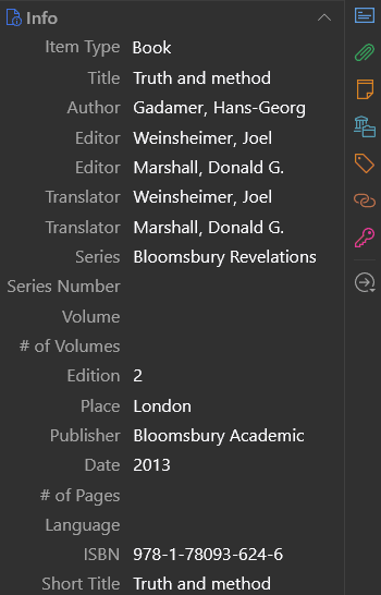 If you have a source where the same individual serves in multiple capacities (e.g., both as an editor and as a translator), enter that person’s name once for each capacity (e.g., once as an Editor and once as a Translator). As appropriate for the citation style you select, Zotero can check whether a record has the same name for multiple creator roles and produce appropriate output (e.g., “ed. and trans. Joel Weinsheimer and Donald G. Marshall”).2