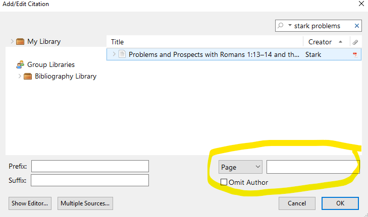 But you often need to cite not not just a particular source but a particular place in that source. With Zotero, you supply this information when you add the source in the citation dialog.