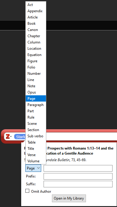 In both places, you’ll find the default “Page” locator type is actually a drop-down menu. When you click that menu, you’ll see the various types of locators that Zotero supports.