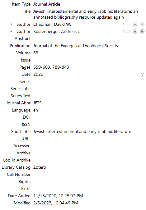 The guidance that the SBL Handbook of Style provides for how to cite these articles contains a couple ambiguities. But assuming for the moment, however, that proper resolutions for these ambiguities are discernible, how might you accommodate such a citation with Zotero?